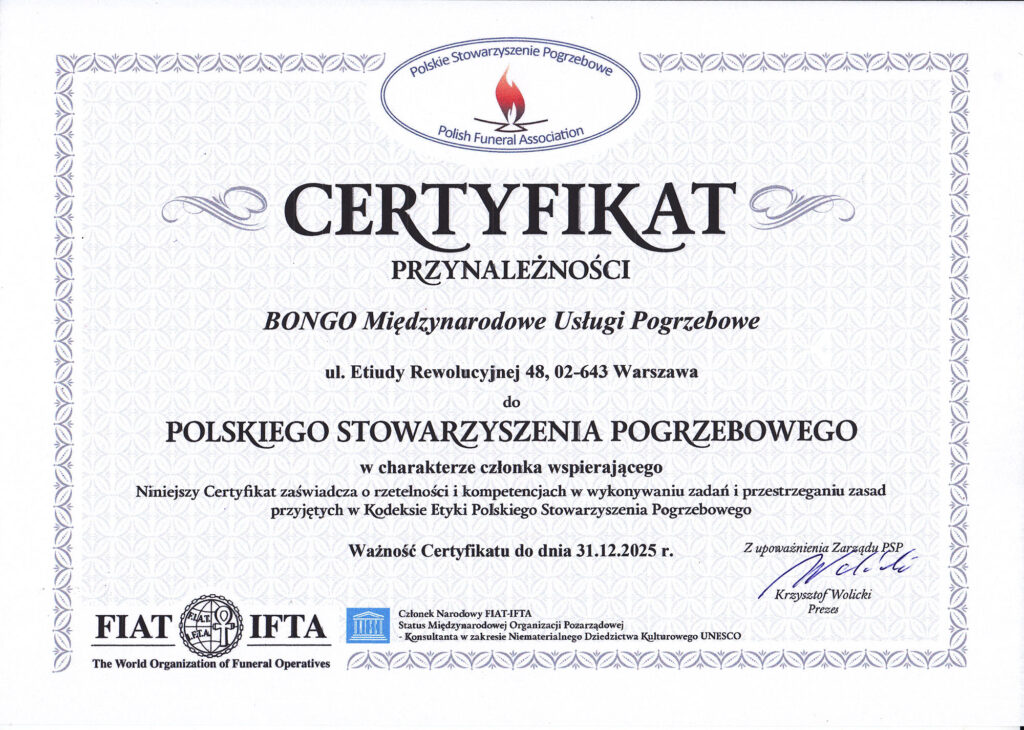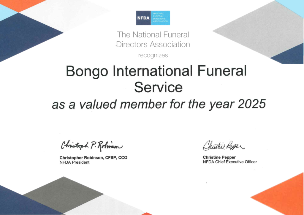 Marka BONGO to tradycja, niezawodność i globalny zasięg, które sprawiają, że jesteśmy liderem w międzynarodowych usługach pogrzebowych. Od lat pomagamy rodzinom na całym świecie, zapewniając pełne wsparcie w organizacji transportu zmarłych oraz ceremonii pogrzebowych, niezależnie od skomplikowania procedur czy odległości. Naszą misją jest niesienie pomocy w najtrudniejszych momentach, oferując kompleksowe, profesjonalne i w pełni dostosowane do indywidualnych potrzeb usługi.